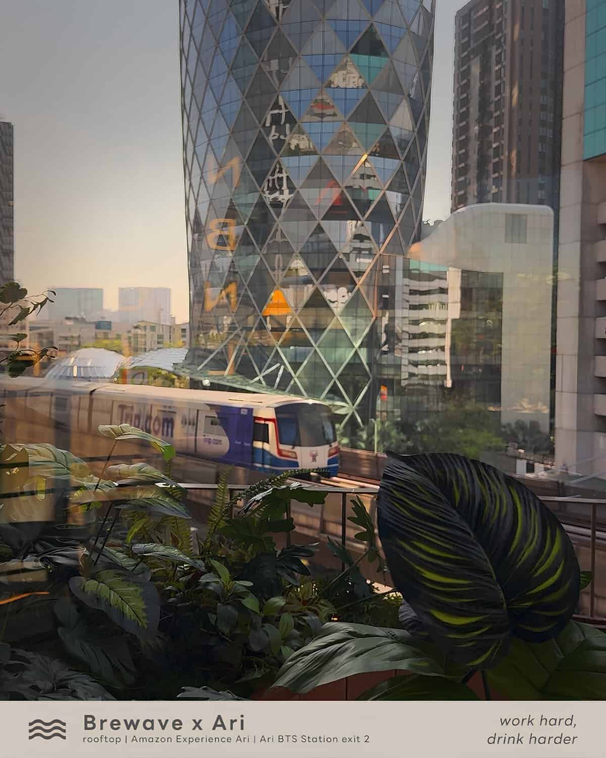 “Escape to Ari’s newest rooftop atop Cafe Amazon Experience. 🌆 Sip our exclusive ‘Awaken Ari’ Coffee Lager amidst panoramic views, great food, and live music. The best sunset in town.”