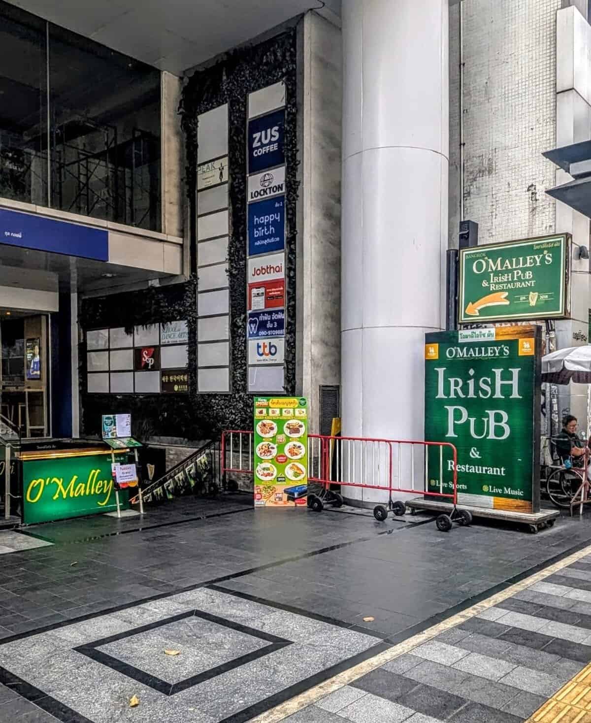 O’Malley’s Irish Pub is one of Bangkok’s traditional style Irish bars serving a full food menu and Guinness, but also offers an area outside, the door for those looking for a smoke. The bar itself is a basement bar, one flight down from the sidewalk above.