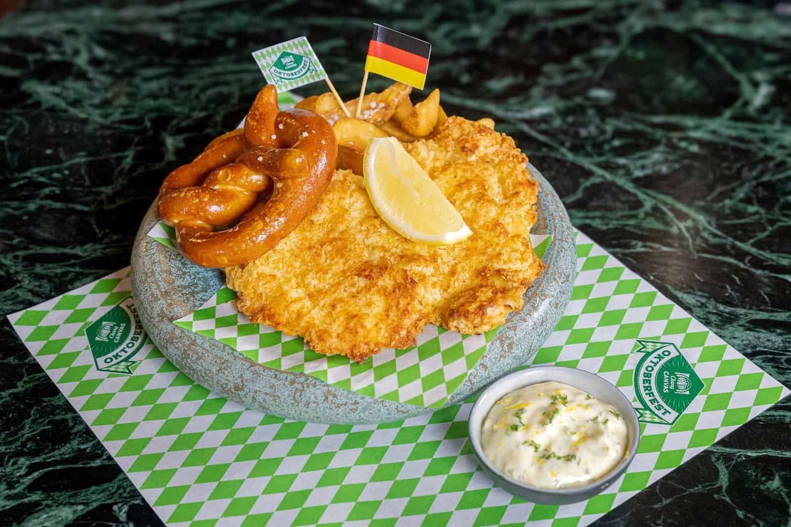 Throughout the Oktoberfest, Chang Canvas is ready to serve special with 6 creative menus created only for this festival. Inspired by the taste and culture of authentic German food, combined with creative ideas in Chang Canvas style , every bite will make you fully immerse in the Oktoberfest atmosphere. For example, the starter menu is “ Garlic Longan Bread”, German-style bread stuffed with garlic butter, followed by the national German fast food menu “ Currywurst & Pretzel”, fragrant grilled Bockwurst pork sausage served with French fries and pretzels, topped with curry ketchup. Another menu that sausage lovers should not miss ! “Slow-Cooked Butter Beer Sausage with Pretzel,” Bratwurst sausage stewed until tender in butter beer sauce that Combined with sauerkraut, potatoes, tomatoes, and served with pretzels, let’s continue with the “ Chicken Schnitzel with Potato Wedge & Pretzel” menu, German- style breaded and fried chicken. The breading is mixed with butter, giving it a very fragrant buttery smell. Served with fried potatoes, pretzels, tartar sauce, and lemon. Another interesting menu is “ Crispy Pork Roll with Mashed Potato & Pretzel,” German-style crispy pork roll stuffed with spinach, served with mashed potatoes, pretzels, and red wine sauce. For those who like a combo set that includes all the highlight menus, we recommend the “ Oktoberfest Platter,” a great value Oktoberfest menu featuring the restaurant’s signature German pork knuckle, crispy skin, soft, fragrant meat, served with German-style fried breaded chicken and grilled Bockwurst sausages . Each menu is served with Pairing sauce and lots of side dishes such as fried potatoes, pretzels, grilled mixed vegetables, and sauerkraut, etc. The price is 1,190 baht.